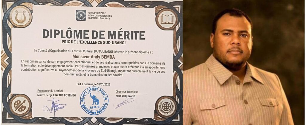 Un nouveau diplôme de mérite a été décerné à Andy Bemba Batindi par l’organisation dénommée Groupe Linzabe pour la mobilisation culturelle (GLM-C) pour honorer son engagement exceptionnel et ses réalisations remarquables dans le domaine de la formation et le développement social en province du Sud-Ubangi.